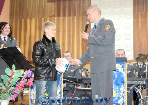 Радость встречи закрепили инструментальная музыка и песни в исполнении оркестра под руководством дирижера Сергея Будениса и солистов Ольги Борисевич и Андрея Григорьева. Песенки из всем знакомых мультфильмов «Бременские музыканты», «Буратино», «Крошка Енот» и других подпевали все в зале. Проверить свои способности в музыке ребята смогли в конкурсе «Угадай мелодию». За правильные ответы все получили небольшие сувениры, которые вручил заместитель начальника Вороновского РОВД подполковник милиции Т.Ф. Шилобрит. Тепло поблагодарили за внимание и помощь дорогих гостей начальник отдела образования, спорта и туризма Е.Я. Ганевич и директор школы-интерната В.В. Михаловский.