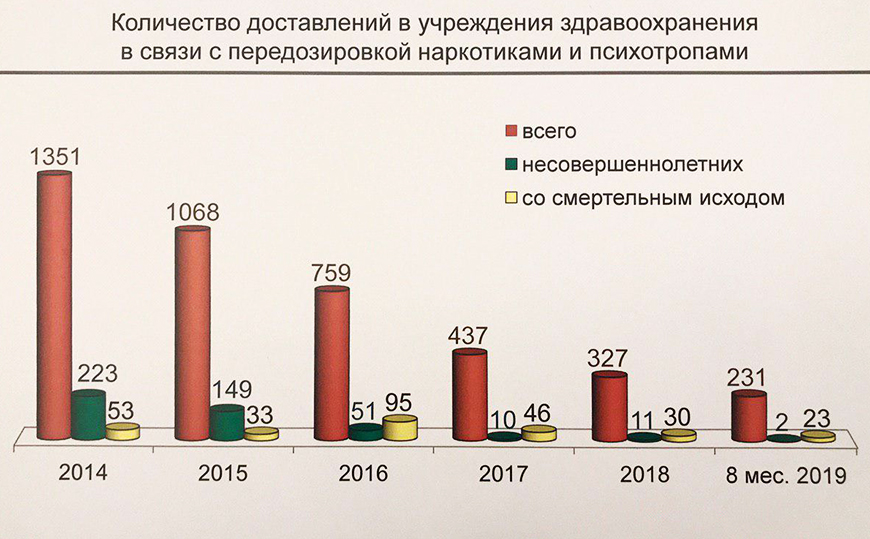 Благодаря принятым мерам число зарегистрированных наркопре-ступлений с 2014 года по 2018 год сократилось в 1,5 раза, а совершенных несовершеннолетними либо с их участием — почти в 5 раз (с 466 до 97). Как сообщает Министерство информации Республики Беларусь, в 2015-2019 годах по уведомлению МВД были приняты решения об ограничении доступа к 558 информационным ресурсам в сети Интернет за распространение информации, направленной на реализацию наркотических средств.