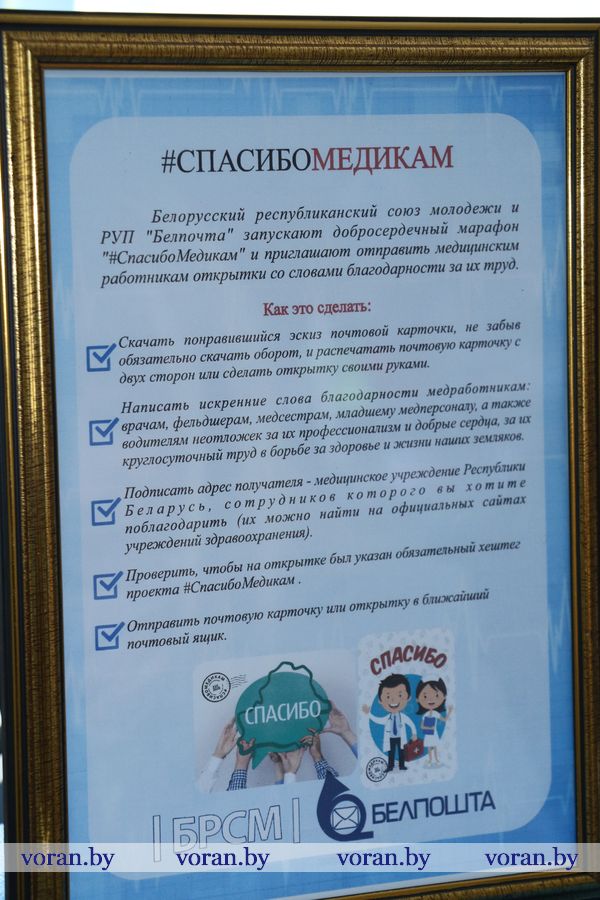 — Этот проект реализует союз молодежи при поддержке РУП «Белпочта», — рассказала главный бухгалтер РК ОО «БРСМ» Ирина Андрушкевич. — Принять в нем участие может любой желающий. Для этого надо на открытке написать слова благодарности коллективу медицинского учреждения или конкретному врачу, медсестре, фельдшеру, младшему медперсоналу и опустить в почтовый ящик. Обязательно указать хештэг #СпасибоМедикам и точный адрес учреждения здравоохранения. Как будет выглядеть ваше почтовое послание, решайте сами. Открытки, например, можно скачать на сайте «Молодежь Беларуси» (www.brsm.by) и распечатать, сделать своими руками или воспользоваться готовыми на ОПС Вороново-1.