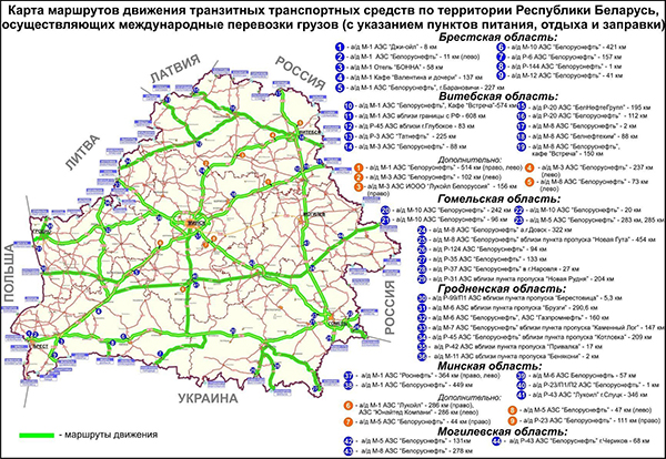 Если коротко, то правилами предписано, что водители, выполняющие транзит, обязаны покинуть Беларусь по кратчайшему маршруту не позднее дня, следующего за днем въезда на ее территорию. Дальнобойщики должны ехать только по республиканским автодорогам, на которых разрешена остановка (стоянка) для отдыха и питания, заправки, исключительно в специально отведенных для этого местах, которые обозначил Минтранс. Исключения: авария, поломка, задержка из-за разгрузки, перегрузки, замены транспортного средства, если это указано в транспортных документах.