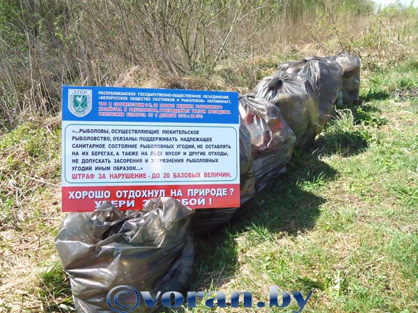 Мероприятия по наведению порядка в прибрежной зоне особенно актуальны сейчас — в преддверии открытия сезона активного отдыха на природе. На призыв выйти на уборку откликнулись старшеклассники из Погородненской школы. Побывав на месте большой уборки и увидев количество собранного в мешки мусора, ребята убедились: бороться с несознательными рыбаками и отдыхающими нужно. По грубым подсчетам объем собранного мусора только на этих водоемах-разливах составил более 30 кубометров. А вот чтобы неряшливые рыбаки не забыли, что за оставленный мусор предусмотрен штраф до 20 базовых величин, на самых видных местах работники БООР установили пластиковые плакаты. Возможно, только так люди поймут, что мусорить возле воды не только неприлично, но и накладно.