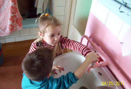 Проводится работа с детьми по практической деятельности — ребята наблюдают за краном в умывальной комнате (на снимке), проверяют, не горит ли без необходимости свет, везде ли оклеены окна. Важной задачей для педагогов является научить детей быть «экономами» и «берегомами»!