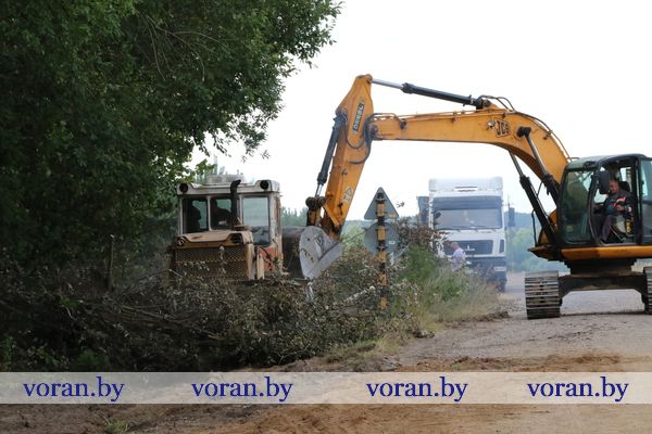Поодаль слышен гул техники: бульдозер, экскаватор, погрузчик, автогрейдер… Мастер Сергей Поболь с Валерием Масюлем, Францем Стефановичем, Андреем Гринюком и другими рабочими в этот день на «белых работах», говоря языком дорожников. Они заняты подготовкой основания и на корчевке кустарника и деревьев в полосе отвода.