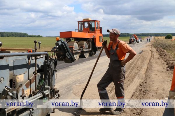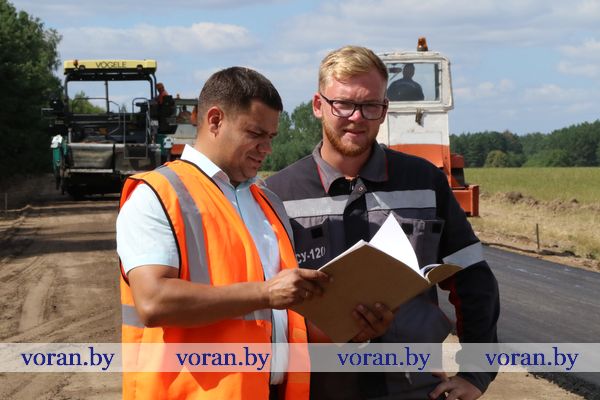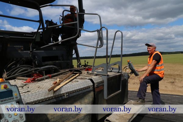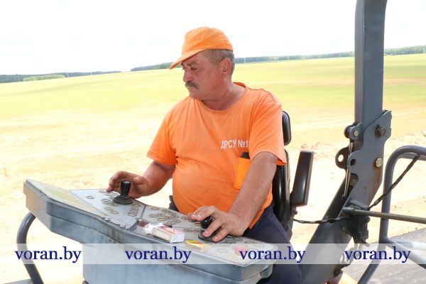 Во время рабочей «экскурсии» по объекту мимо нас все время снуют МАЗы, большинство из них задействованы на подвозе асфальтобетонной смеси. На сегодняшний день здесь уже уложено порядка 1 400 тонн, и это всего лишь выравнивающий слой. Ближе к деревне Линги снова скопление техники: помимо асфальтоукладочной машины, одних катков разного «калибра» и формата три единицы. На укладке асфальтобетона трудится бригада под руководством молодого мастера Александра Пивоварчика. Парень после окончания Полоцкого университета по распределению приехал в родное Вороново и вот уже год набирается опыта в профессии. К слову, он из династии дорожников. Его отец Иван Иванович более пятнадцати лет трудился в этой же организации, а пять лет назад перешел в ДЭУ-55. Так что дорожные темы актуальны и дома у Пивоварчиков.