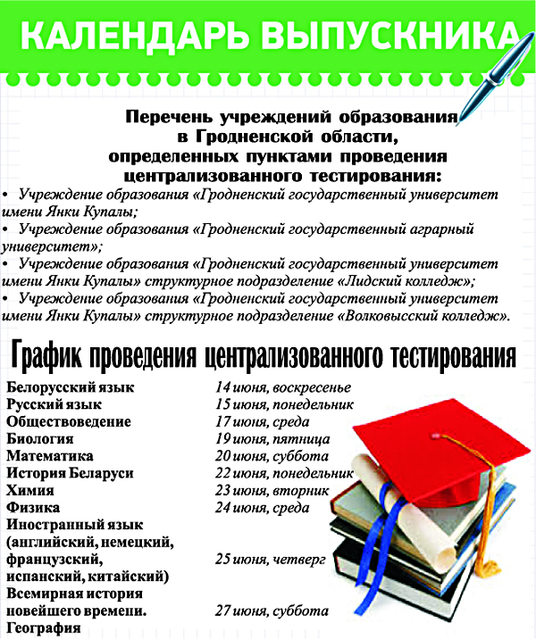 Напоминаем абитуриентам: те, кто по определенным причинам не сможет сдать ЦТ в установленные дни, могут пройти его в резервный день — 2 июля. Зарегистрироваться на эти тесты можно 26 и 29 июня — с 9.00 до 19.00, 27 и 28 июня — с 9.00 до 18.00. Ближайший пункт регистрации — Гродненский государственный университет.