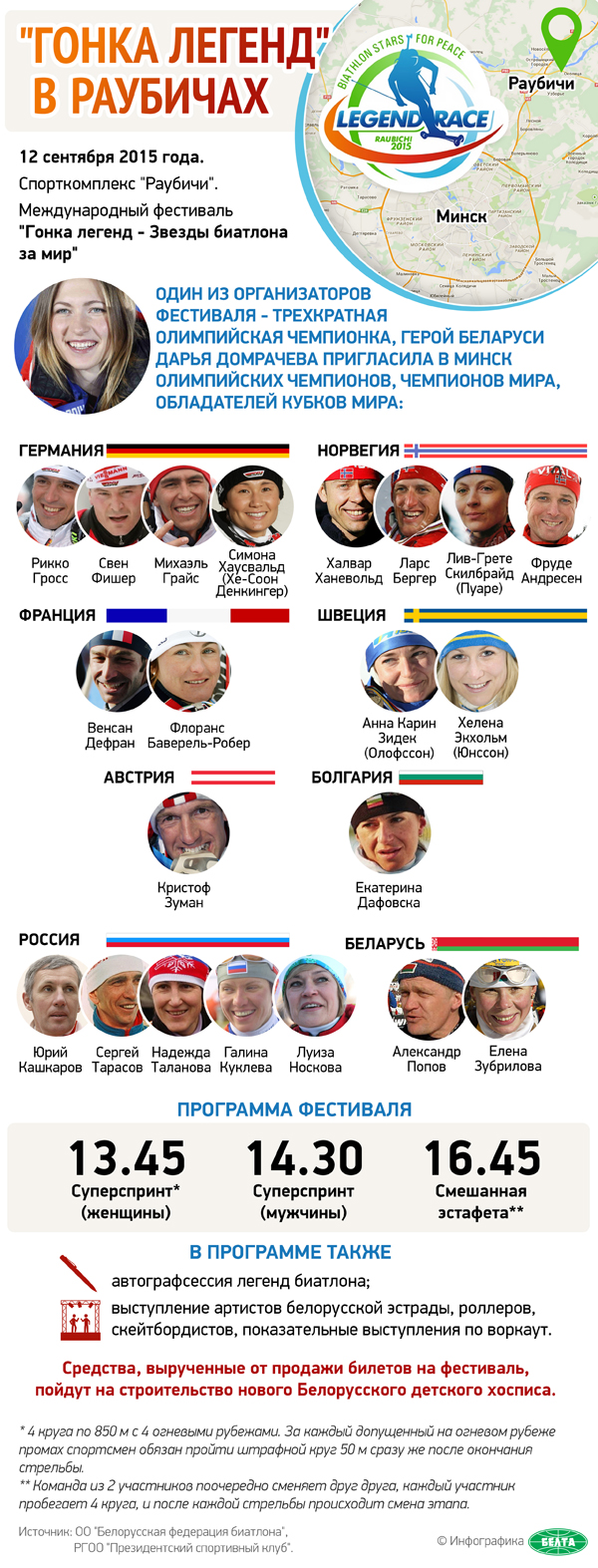Фестиваль "Гонка легенд - звезды биатлона за мир" пройдет 12 сентября в Республиканском центре олимпийской подготовки "Раубичи". Организаторами фестиваля выступают Белорусская федерация биатлона, Министерство спорта и туризма, Национальный олимпийский комитет и Президентский спортивный клуб.