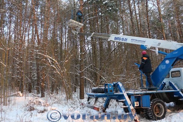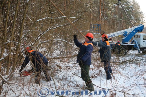 Циклоны «Даниэлла» и «Эмма» уже давно за пределами Беларуси, но последствия разгулявшейся стихии устраняют еще и теперь. Из-за них несколько недель назад обесточенными оказались около полутора тысяч населенных пунктов. Основная причина — обрыв линий электропередачи. Провода не выдерживали тяжести снега и льда, но больше всего вреда нанесли упавшие на них деревья. Подачу электричества в пострадавших районах восстановили. Чтобы впредь быть готовыми к противостоянию снежным ураганам, силы мобилизовали ведомства электросетей и лесного хозяйства — линии электропередачи должны быть на безопасном расстоянии от деревьев. Теперь оно составляет по 10 метров в каждую сторону, в проекте изменения параметров, ведь высота дерева может достигать и 30 метров.Совместной мобильной группой внепланово были обследованы участки электропередач в лесных массивах Вороновщины. Протяженность их в районе составляет 58 километров. В первую очередь приступили к валке угрожающих деревьев, удалению подлежат 3 300 единиц. На прошлой неделе расчистку начали на участке, расположенном возле деревни Полипница. Вороновский РЭС предоставил специальную технику, которой умело управляют водители В.В. Суцкель, С.Г. Потько и А.Р. Цилиндь. Бригада электромонтеров И.М. Дегтяренко, Р.С. Родевича и П.М. Журавского под руководством мастера бригады А.В. Свирюкова и бригадира И.А. Дайлидко обеспечивают соблюдение технологии и безопасность работы на участке, а также отключают или подключают к другим подстанциям электроснабжение прилегающих населенных пунктов. На этот раз неудобства — отсутствие электричества — испытывали немногочисленные жители д. Линги. Об этом они были предупреждены заранее. К работе бригады РЭСа и Жирмунского лесничества приступают с 10 утра и завершают ее к 17 вечера. Несмотря на погодные условия, дело спорится. Сказать, что оно опасное, — не сказать ничего. У меня, наблюдающей за валкой издалека, просто захватывало дух от вида падающего дерева и облака поднявшегося в воздух снега. Задачи бригадира и мастера — ежеминутно строго контролировать соблюдение правил безопасности и предусмотреть всевозможные риски, ведь на кону здоровье и жизнь людей.
