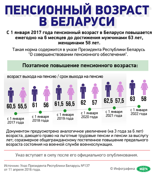 1.1. общеустановленный пенсионный возраст (статья 11 Закона Республики Беларусь от 17 апреля 1992 года «О пенсионном обеспечении» (Ведамасцi Вярхоўнага Савета Рэспублiкi Беларусь, 1992 г., № 17, ст. 275) повышается ежегодно с 1 января на 6 месяцев до достижения возраста мужчинами 63 лет, женщинами — 58 лет;