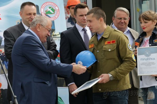 Почетные гости вручили путевки на участие в возведении объектов АЭС в нынешнем стройотрядовском сезоне и символические каски командирам линейных отрядов. Это своеобразная передача эстафеты от стройотрядовцев прошлых поколений нынешним.