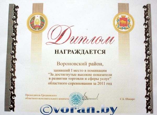 Вороновский район стал победителем ежегодного областного соревнования города Гродно, районов в городе Гродно и районов Гродненской области за достижение высоких показателей в экономическом и социально-культурном развитии в 2011 году в номинации «За достигнутые высокие показатели в развитии торговли и сферы услуг».