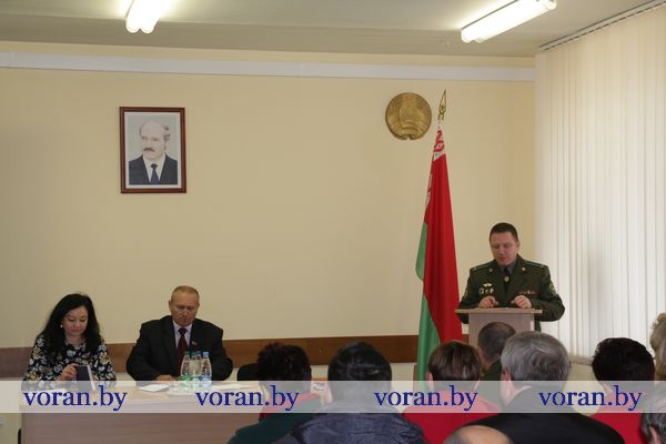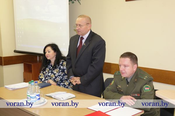 О работе местных распорядительных и исполнительных органов, идеологической вертикали, общественности района по реализации государственной пограничной политики, по формированию патриотизма граждан приграничья, их готовности к участию в обеспечении пограничной безопасности рассказала главный специалист отдела идеологической работы, культуры и по делам молодежи Вороновского райисполкома Людмила Неделько. Опытом работы с населением приграничного сельсовета поделилась председатель Конвелишского сельисполкома Ирина Пильжис. А вот о совместной работе учреждений образования с Лидским пограничным отрядом по патриотическому воспитанию молодежи рассказала заместитель директора по воспитательной работе Дотишской СШ Э. Тиханович. Свое выступление Эльвира Ивановна подкрепила фрагментами видеофильмов, которые сняли и смонтировали ученики школы.
