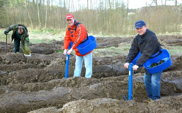 Эту технологию в Гродненской области освоили три года назад. Семена сосны выращивают до небольшого саженца в кассетах в специальных тепличных условиях. Затем саженцы помещают в короба, откуда их достают не руками, а с помощью специальной посадочной трубы. В этом случае с посадкой справляется один человек. А вот лиственницу высаживали традиционным способом: один человек с помощью меча Колесова прорубал лунку, другой опускал в нее саженец.