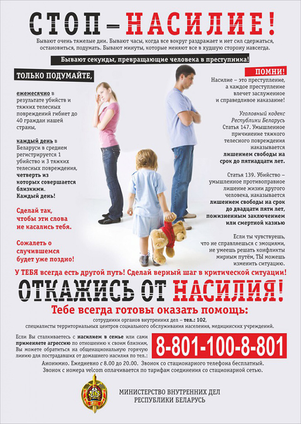 Помните! Не стоит тянуть до последнего момента. Если вы страдаете от домашнего насилия, сообщите об этом в милицию. В УВД Гродненского облисполкома круглосуточно работает телефон доверия, позвонив по номеру: 8 — (0152) – 79-72-58 вы получите всю необходимую помощь.