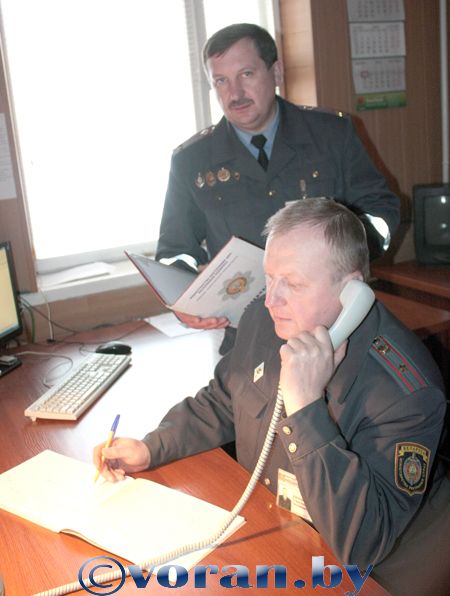 На снимках: следственно-оперативная группа спешит на выезд; начальник отдела охраны правопорядка и профилактики Вороновского РОВД, подполковник милиции П. Мелько и старший инспектор - дежурный, майор милиции С. Дзекевич на посту.