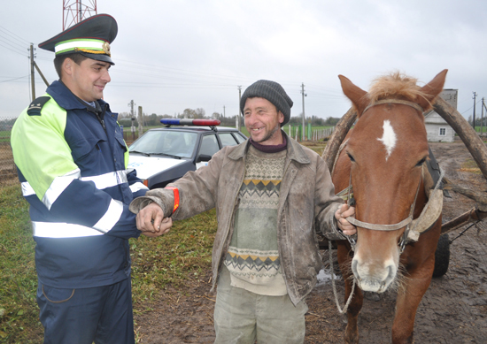 На снимке: инспектор ДПС ОГАИ Вороновского РОВД Д. Губейко одевает фликер участнику