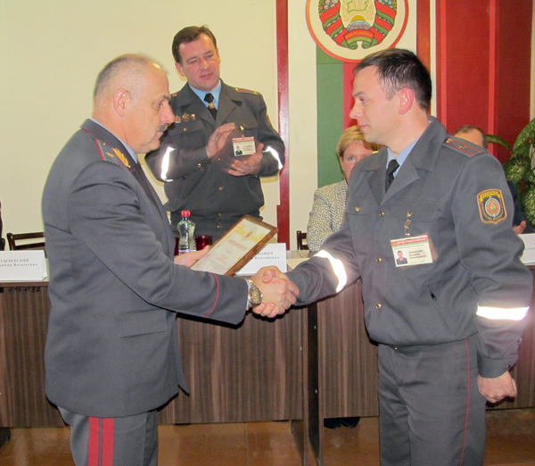 С положительной стороны была отмечена работа старшего инспектора уголовно-исполнительной инспекции майора милиции Р.В. Ковзуся, старшего оперуполномоченного группы по борьбе с экономическими преступлениями подполковника милиции Ю.В. Ларионова, а также ВРИОД начальника отделения ГАИ П.Б. Бутько. В завершение начальник УВД Гродненского облисполкома генерал-майор милиции Владимир Васильевич Сычевский вручил Грамоту за профессионализм и проявленную инициативу при выполнении служебных задач начальнику отдела охраны правопорядка и профилактики милиции общественной безопасности РОВД подполковнику милиции П.С. Мелько, а также Благодарность — оперуполномоченному отделения уголовного розыска майору милиции В.Б. Жуковскому (на снимке).