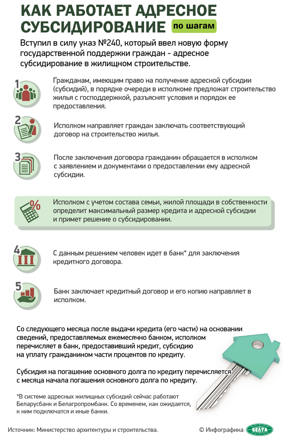 *В системе адресных жилищных субсидий сейчас работают Беларусбанк и Белагропромбанк. Со временем, как ожидается, к ним подключатся и иные банки.