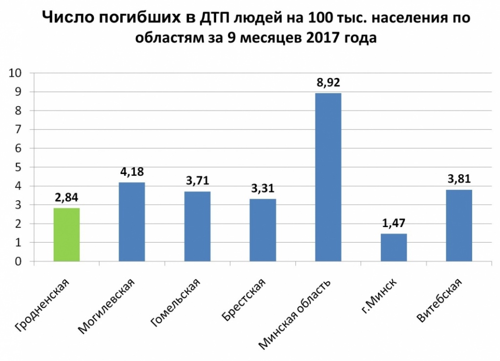 По итогам 9 месяцев такой относительный показатель, как число погибших в ДТП людей на 100 тысяч населения, указывает на то, что уровень смертности на дорогах Гродненской области, как и прежде, остается одним из самых низких в республике.