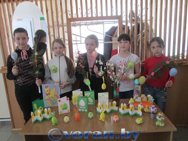 На здымку: самыя актыўныя ўдзельнікі “Вострава захапленняў” — М. Бабкінь, А. Кудзьма, М. Ладыш, М. Філон і Д. Будрэвіч — са сваімі вялікоднымі вырабамі.