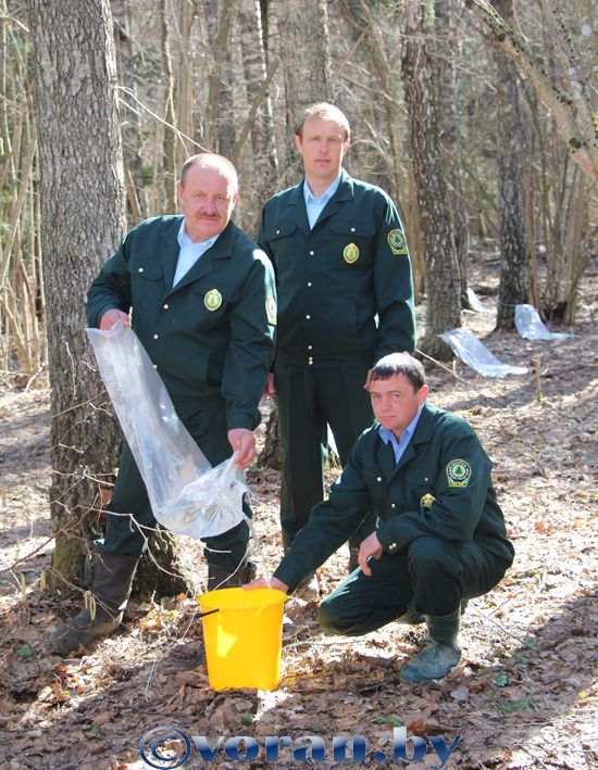 На снимке: лесники И.В. Букляревич, В.В. Андрушкевич и А.А. Козак во время сбора сока.