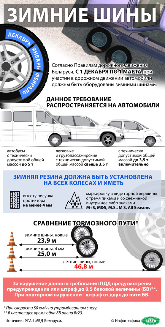 Согласно Правилам дорожного движения Беларуси, с 1 декабря по 1 марта при участии в дорожном движении автомобили должны быть оборудованы зимними шинами.