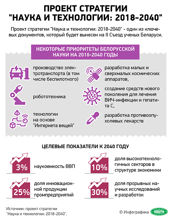 Ключевым документом, который вынесен на II Съезд ученых Беларуси, стал проект стратегии "Наука и технологии: 2018-2040". В настоящее время данный проект проходит общественное обсуждение. В стратегии определены приоритеты долгосрочного развития науки и технологий, а также комплекс инструментов совершенствования научно-технической сферы, которые обеспечат новое качество экономического роста Беларуси и выход в перспективе на мировой уровень по ряду направлений. Стратегия разработана учеными НАН Беларуси с учетом замечаний и предложений, поступивших от органов госуправления, рабочих групп и отдельных ученых. Предполагается, что благодаря реализации стратегии к 2040 году наукоемкость ВВП должна составить 3%, доля прорывных научных исследований и разработок - 30% в общем объеме, доля высокотехнологичных секторов в структуре экономики - 10%. В общем объеме производства промпредприятий 25% будет занимать инновационная продукция.