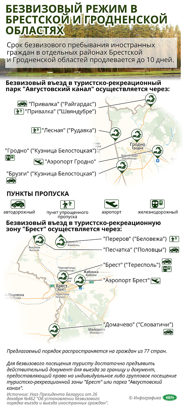 Так, для иностранных туристов парка "Августовский канал" будет разрешено пребывание на территории Гродно и всего Гродненского района, для посетителей Национального парка "Беловежская пуща" - на территории туристско-рекреационной зоны "Брест" (Брест, Бресткий, Жабинковский, Каменецкий и Пружанский районы Брестской области, Свислочский район Гродненской области). При этом для посещения Августовского канала или туристско-рекреационной зоны "Брест" иностранным гражданам следует иметь при себе действительный документ для выезда за границу и документ, предоставляющий право на индивидуальное или групповое посещение соответствующей территории. Предлагаемый порядок распространяется на граждан из 77 стран.