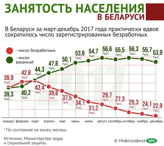 В Беларуси за март-декабрь 2017 года практически вдвое сократилось число зарегистрированных безработных.