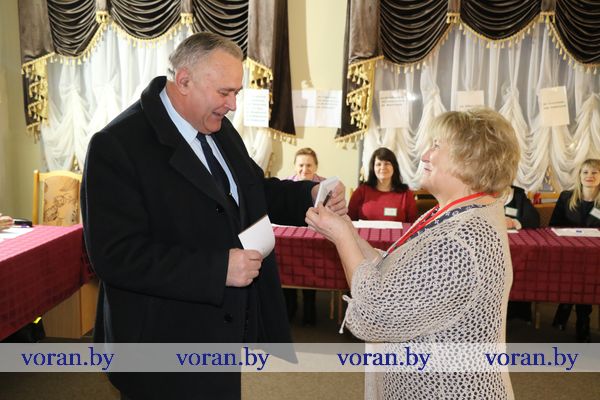 По уже сложившейся традиции первым, кто пришел на этот участок отдать свой голос в поддержку народных избранников, стал председатель райисполкома Н.А. Розум. Он поздравил всех с важным событием и пожелал успешной и плодотворной работы избирательной комиссии. Соблюдя необходимые процедуры, руководитель района опустил бюллетени в урну.