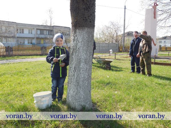 Особое внимание — побелке деревьев: их ни много ни мало, а двести пятьдесят штук. Начали со сквера возле памятника активистам, погибшим от рук врагов советской власти. По-деловому, со знанием дела старался помочь бабушке Дануте Юзефовне Будревич пятилетний Егор Павлов (на снимке). Аккуратно, чтобы не испачкаться, он держал в руках кисточку. Старался, чтобы его дерево забелело не хуже, чем у взрослых.