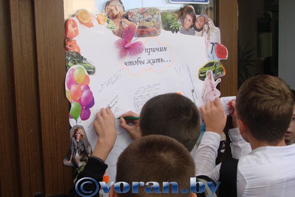 10 сентября в одиннадцатый раз мировая общественность отметила Всемирный день предупреждения суицидов. Не остались в стороне от этого события педагоги и школьники Вороновской СШ, организовавшие флэшмоб во дворе школы на переменах. Мероприятие, посвященное этому дню, прошло под девизом: «Жить — это здорово, жить — это круто!». Этот позитивный и энергичный проект предоставляет возможность молодежи проявить активность в борьбе за жизнь. Основными инструментами в этой кампании являются музыка, танец и позитив, которые помогают преодолеть стену молчания, касающуюся этой проблемы. У входа в учебное заведение был установлен стенд для анонимного опроса: «Я радуюсь, когда…» и «Я огорчаюсь, когда…».