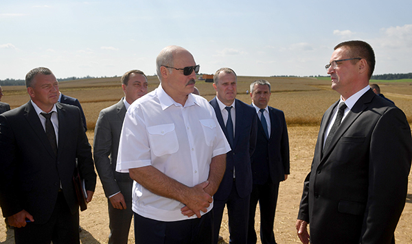 Глава государства посетил сегодня поля 1-й Минской птицефабрики, где ему доложили о ходе уборки зерновых в стране и регионе. По словам министра сельского хозяйства и продовольствия Леонида Зайца, в республике уже убрано более 800 тыс. га, что составляет около 41% площади зерновых и зернобобовых культур. Намолочено 2,5 млн т зерна с урожайностью 28,8 ц/га.