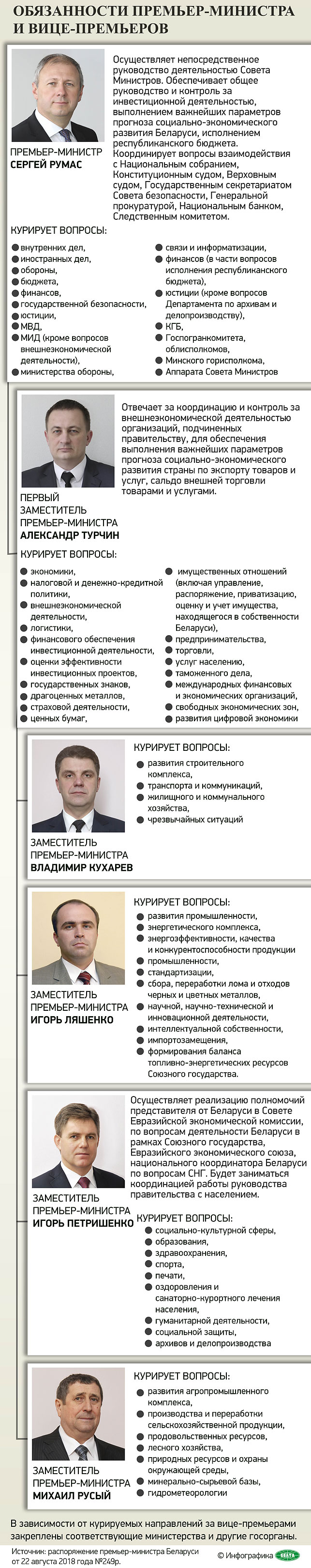 Распределение обязанностей между премьер-министром, его заместителями и руководителем Аппарата Совмина утверждено распоряжением премьер-министра от 22 августа 2018 года №249р.