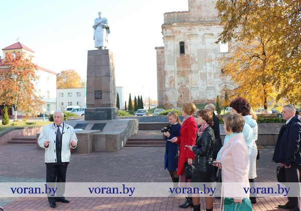 Экскурсия началась на Ратушной площади, на которой сконцентрированы архитектурные и культурно-исторические памятники горпоселка: частично сохранившийся до наших дней костел Пресвятой Девы Марии, построенный в начале XVII века в стиле раннего барокко, братская могила и Стена памяти, на которой увековечены имена погибших во время Великой Отечественной войны. К 500-летию Большой Берестовицы 12 лет назад на центральной площади была установлена декоративно-скульптурная композиция «Дерево жизни», увенчанная фигуркой белки — символа города. Это одно из популярнейших мест фотосессий как для местных жителей, так и для гостей района. Журналисты также не отказали себе в этом и сделали фото на память.
