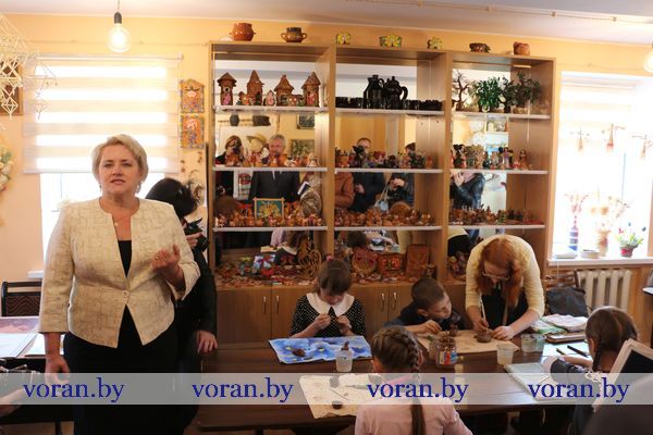 Далее представителей СМИ Гродненщины радушно встречала заведующая отделом ремесел Тамара Касьян. Главная задача коллектива — сохранять и развивать традиционные ремесла и промыслы: соломоплетение, аппликацию из соломки, керамику, вышивку и роспись по дереву. С этой целью здесь действуют кружки для детей и занятия для взрослых.