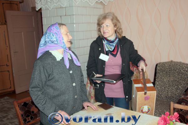 В воскресенье, 23 марта, в основной день голосования все 22 участка в нашем районе приветливо распахнули свои двери для избирателей. Как и жители всей Республики Беларусь, они выбирали тех, кто на местном уровне в ближайшие четыре года будет отстаивать их интересы. Недаром же депутатов называют избранниками народа.Несмотря на выходной день некоторые пришли на избирательные участки практически сразу после их открытия. Радует тот факт, что на выборы идут семьями: взрослые берут с собой детей. Члены участковой комиссии Беняконского участка №6 считают, что тон в основном задают люди старшего возраста. Кстати, буквально в 9.00 некоторые члены этой комиссии отправились с переносной урной в отдаленные деревни к избирателям, пожелавшим проголосовать на дому. Причины понятны — преклонный возраст, неважное самочувствие. Начался маршрут с д. Тусуманцы, где в основном остались одни старики. Марианна Владиславовна Францкевич первой радостно встретила ранних гостей. Всю жизнь она проработала полеводом, сейчас на заслуженном отдыхе, но сохраняет активную жизненную позицию. Женщина живет одна: похоронила мужа и двоих сыновей. На жизнь не жалуется, надежной опорой ей стали дочь с зятем, которые регулярно ее навещают.