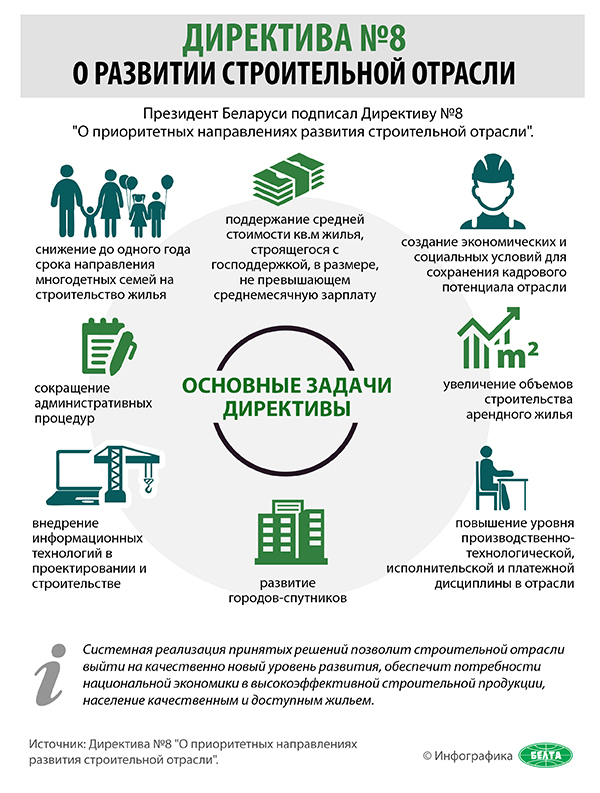 — В Директиве №8 «О приоритетных направлениях развития строительной отрасли» отмечено, что строительство во многом определяет состояние экономики и решение социальных задач в республике. Новый документ нацелен на устранение имеющихся в этой сфере проблем и на повышение ее эффективности. Речь идет о соблюдении нормативных сроков строительства объектов, об усилении ответственности проектных организаций за качество проектной документации, о поддержании средней стоимости квадратного метра жилья, строящегося с господдержкой, на уровне среднемесячной зарплаты, снижении до одного года срока направления многодетных семей на строительство жилья и др.
