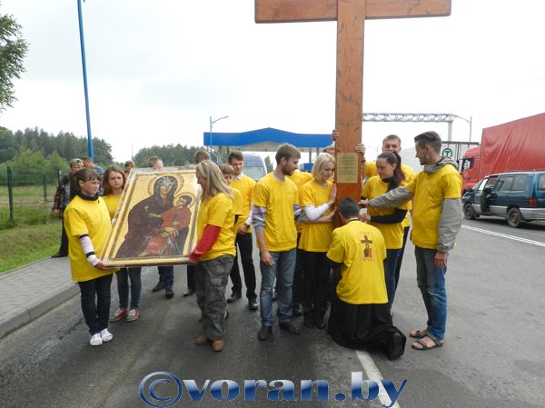 Святы Ян Павел II 22 красавіка 1984г., уручаючы гэты крыж, звярнуўся да моладзі: «Нясіце яго на ўвесь свет як знак любові, якой Хрыстос узлюбіў чалавецтва, і абвяшчайце ўсім, што толькі ў Хрысце, памерлым і ўваскрослым, ёсць уратаванне і адкупленне». На працягу 20 гадоў — крыж і абраз ужо наведалі 4 кантыненты, пабывалі ў сотнях краін. Пры крыжы і абразе збіраліся мільёны вернікаў. Падчас апошніх Сусветных дзён моладзі ў Бразіліі (ліпень 2013г.) каля іх памалілася прыкладна 3 мільёны моладзі з цэлага свету. Канферэнцыя каталіцкіх біскупаў у Беларусі з нагоды Сусветнага дня моладзі, які ў 2016 годзе адбудзецца ў Кракаве (Польшча), атрымала прапанову правесці перэгрынацыю крыжа і абраза ў каталіцкіх дыяцэзіях Беларусі. 28 чэрвеня на беларуска-польскай Дзяржаўнай мяжы адбылася ўрачыстая перадача духоўных атрыбутаў польскай моладдзю беларускай. На працягу амаль што двух тыдняў гэтыя сімвалы наведвалі каталіцкія парафіі ў розных дыяцэзіях. Галоўным каардынатарам перэгрынацыі крыжа і абраза Маці Божай у Гродзенскай дыяцэзіі стаў ксёндз Антоній Грэмза, які адзначыў:— Асноўная мэта — паказаць праз перэгрынацыю крыжа і абраза адзінства беларускай моладзі з моладдзю ўсяго свету, а таксама неабходнасць супольнага чування разам з Марыяй пад крыжам Хрыста. Духоўнасць крыжа павінна пабудзіць нас ступіць на дарогу патрабаванняў і барацьбы за перамогу сапраўднай Любові. У гэтым моладзі будзе дапамагаць Марыя, Маці цудоўнай Любові. Перад тым, як прыбыць у Тракельскі санктуарый, крыж і абраз “наведалі” ўсе найбольшыя па колькасці пешыя пілігрымкі. У наш санктуарый сімвалы Дзён моладзі ўнеслі маладыя вернікі парафіі Узвышэння Святога Крыжа з Ліды. Крыжовы шлях, які адбыўся познім вечарам 11 ліпеня, дапамог пілігрымам усвядоміць, што той, хто хоча быць сапраўдным вучнем Хрыста, мусіць штодзённа браць на свае плечы крыж і ісці за Госпадам, наследуючы Яго. Пад крыжам Сусветнага дня моладзі гэтыя два дні маліліся ўсе жадаючыя. А пасля імшы, якая завяршыла ўрачыстасці, крыж і абраз адправіліся на беларуска-літоў-скую мяжу, дзе іх ужо чакала дэлегацыя з Літвы. Група маладых людзей на чале з ксян-дзом Антоніем Грэмзам урачыста перадала сімвалы з рук у рукі. І з гэтай хвіліны сімвалы Сусветнага дня моладзі пачалі свой шлях па Літве. Наталля ІВУЦЬ. Фота аўтара.