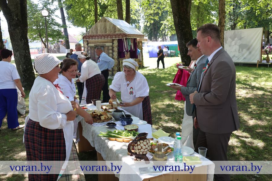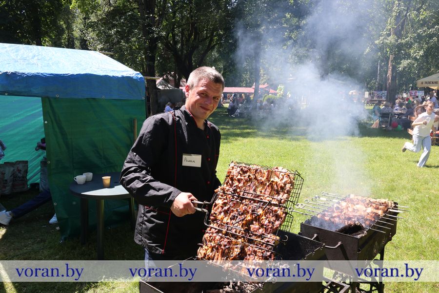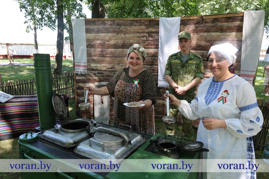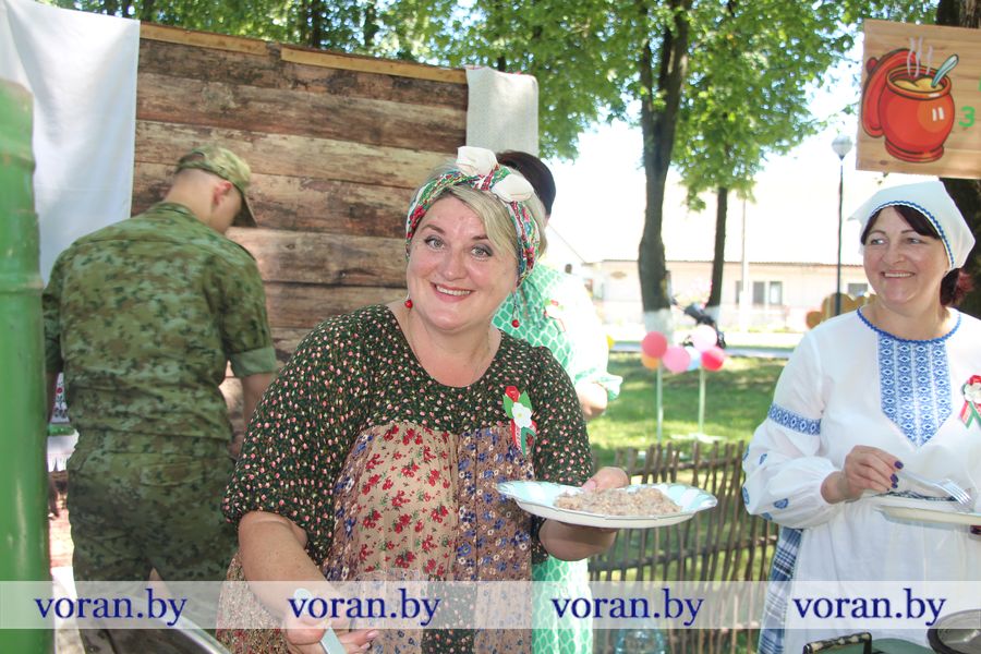 Водар духмяных страў вабіў да сябе з усіх куткоў парка. Ох, і смакаваў брэнд нацкай зямлі — дранікі па адмысловаму рэцэпту. А яешня? Яна гатавалася акурат на вачах варанаўчан. За вушы не адцягнеш ад яе! А тут побач ужо паспела грачаная каша. Ды не абы якая! З салдацкім запалам па бабулінаму рэцэпту. Падсілкаваўшыся ўдосталь дзякуючы кульработнікам раёна ды ваеннаслужачым-пагранічнікам, самы час да забаў.