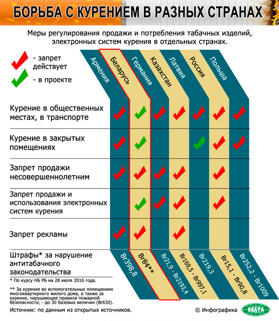 Так, в Беларуси запрещены реклама, открытая выкладка табачных изделий, имитация внешнего вида и (или) использование наименований видов табачных изделий в наименованиях товаров, не являющихся табачными изделиями; оптовая, розничная торговля такими товарами, продажа табачных изделий гражданам Беларуси, иностранным гражданам и лицам без гражданства в возрасте до 18 лет.