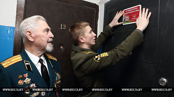 Табличку с надписью «Тут жыве ветэран Вялiкай Айчыннай вайны. Дзякуй за Перамогу!» представители областного отделения БФМ, ученики средней школы №20 Гродно, курсанты военного факультета Гродненского государственного университета имени Янки Купалы прикрепили на двери квартиры ветерана Великой Отечественной войны Николая Киселева. Он воевал на 1-м и 2-м Прибалтийских фронтах, участник взятия Кенигсберга, освобождения Варшавы, ликвидации Курляндской группировки. Акция инициирована в год 75-летия с начала Великой Отечественной войны с целью еще раз привлечь внимание общественности к ветеранам, окружить их общей заботой и вниманием.http://www.belta.by/