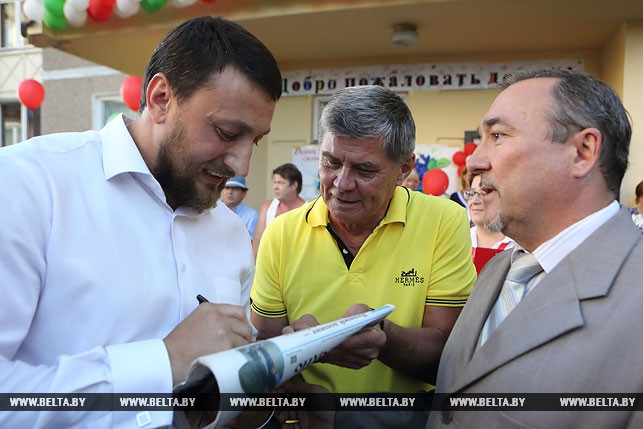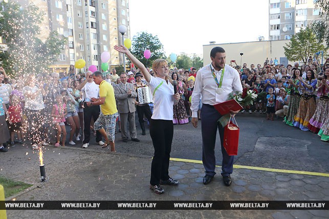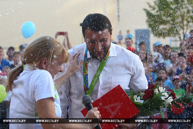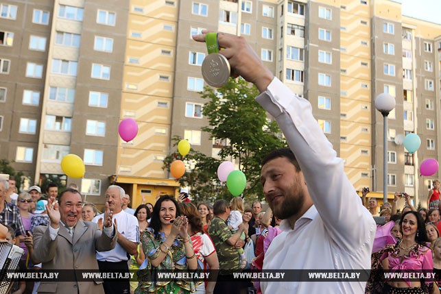 "Соседи - одни из самых строгих моих болельщиков. Признаюсь, на таких встречах волнуюсь больше, чем в секторе. Приятно, и спасибо вам всем за поддержку и доверие", - обратился к соседям Иван Тихон. По традиции его медаль "обмыли" шампанским, устроили фейерверк, в шутливой форме предложили повторить медальную попытку, метнув импровизированный молот. К медалисту Рио буквально выстроилась очередь: все желали и поздравить, и сфотографироваться. Иван Тихон не отказывал никому.
