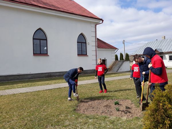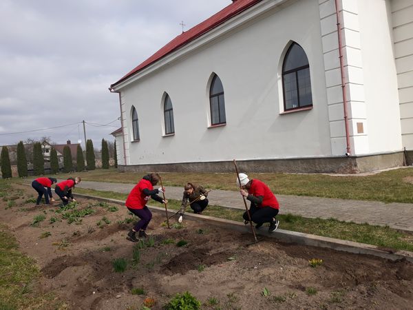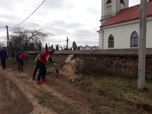 Часть школьников и работников УПК занималась уборкой школьной территории от мусора. Волонтерские отряды «Победа» и «Милосердие» во главе с педагогом-организатором Светланой Лыщик благоустроили территорию возле костела Святой Троицы и церкви Святых мучеников Антония, Иоанна и Евстафия Виленских.