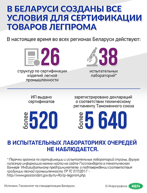 В подготовленном к брифингу пресс-релизе Государственного комитета по стандартизации сообщается, что в Беларуси имеется достаточная инфраструктура органов по сертификации изделий легкой промышленности (их 26) и испытательных лабораторий (38). Такие испытательные лаборатории работают как в системе Госстандарта, так и на базе организаций Минздрава, концерна "Беллегпром", частных организаций и без ведомственной подчиненности.
