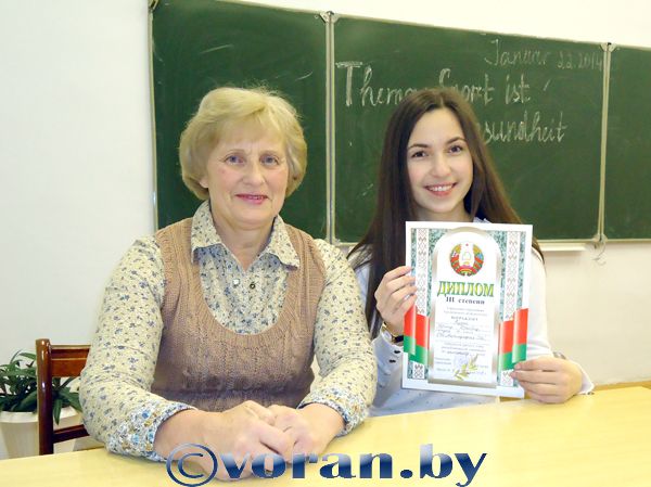 К успеху в областном этапе республиканской олимпиады по немецкому языку выпускница Жирмунской средней школы Ирина Кузюк (на снимке 4) шла с восьмого класса. В этом году она завоевала Диплом III степени. Это первый в истории школы результат областного уровня. Совместный плодотворный труд ученицы и ее наставника, опытного педагога Антонины Ивановны Радион, не ограничивается только обычными уроками. Факультативы, дополнительные занятия, самостоятельная работа Ирины и ее интерес к иностранному языку дают свои плоды. В прошлом году на республиканском конкурсе исследовательских работ у нее также было третье место.
