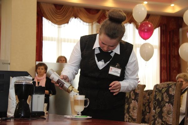 Официанты выступили в роли бариста: — готовили капучино и латте на профессиональном оборудовании, презентовали свой авторский напиток. Наталья на суд жюри представила «Роузен карамель» из взбитого молока, шоколада, кофе эспрессо, карамельного сиропа и сливок. Рецепт с красивым названием был разработан специально для конкурса, но его вкус смогут оценить и посетители ресторана в Вороново. Он будет включен в меню. Кроме того, официанты соревновались в сервировке стола к вечернему обслуживанию и в оформлении свадебного сладкого стола — «Кенди-бара». Представительница Вороновщины Наталья взяла за основу цвета белый и марсала — винно-красный с коричневым оттенком, который в моде уже несколько сезонов. Воздушность и романтику ее «Кенди-бару» придавали пионы, фатин, канделябры и свечи.