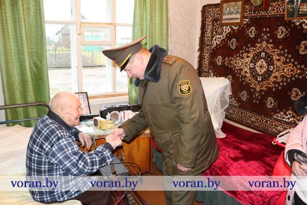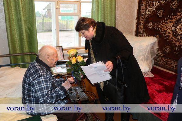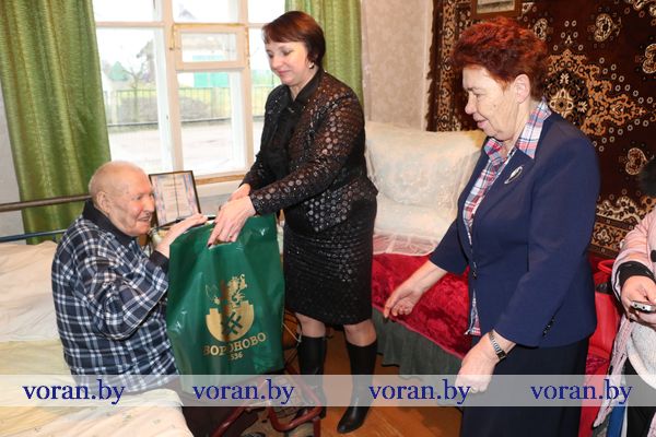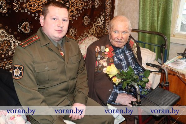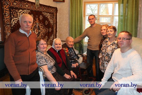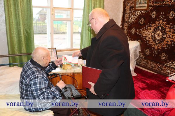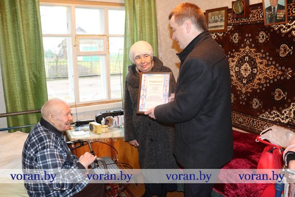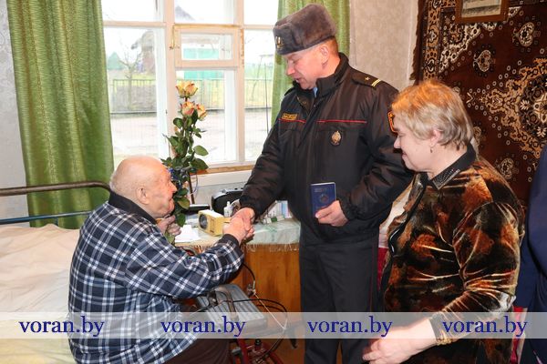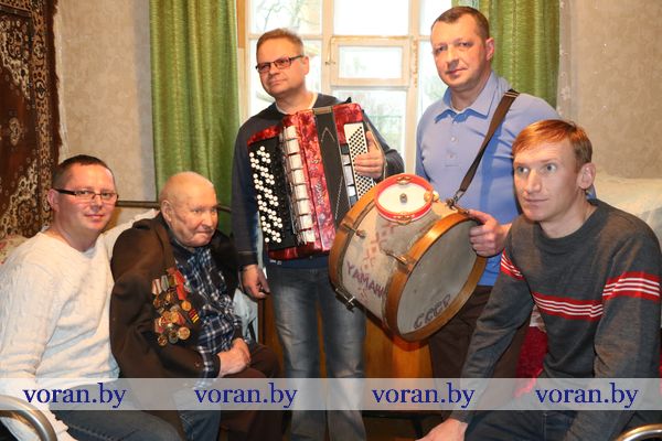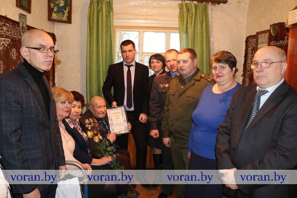 Начальник отделения по гражданству и миграции Вороновского РОВД С.В. Баенский вручил юбиляру новый паспорт. У внука Виталия был для дедушки музыкальный подарок. Он вместе со своими друзьями-музыкантами из народного ансамбля народной песни «Зараніца» устроил настоящий концерт из песен военных лет, в такт которым юбиляр не только подпевал, но и сидя пританцовывал.