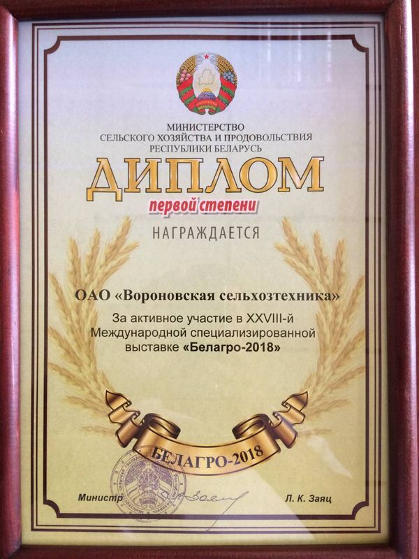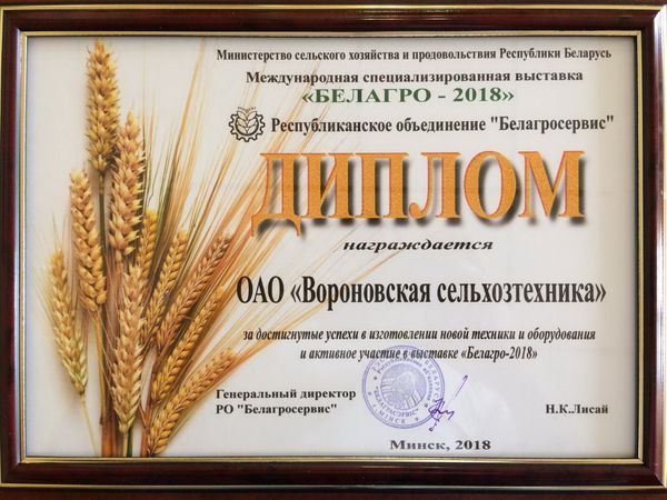 Кроме удачно заключенных контрактов, предприятие получило и ряд наград. Министерство сельского хозяйства и продовольствия Республики Беларусь отметило «Вороновскую сельхозтехнику» Дипломом I степени за активное участие в ХХVIII Международной специализированной выставке «Белагро-2018». А республиканское объединение «Белагросервис» вручило Диплом за достигнутые успехи в изготовлении новой техники и оборудования и активное участие в выставке.