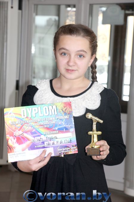 Вместе с ней на фестивале побывала еще одна активистка этой школы. Шестиклассница Ангелина Ивуть была награждена Дипломом отличия в своей возрастной категории. Соперницы вороновских юных звездочек были очень сильными в вокальном плане и представляли эстрадные студии Польши, России, Украины, Литвы и др. У нас в Вороново нет пока своей эстрадной студии, но несмотря на это наши девчонки достойно выступили. Своими успехами Даша и Ангелина во многом обязаны наставникам Р.А. Шарко и Н.В. Вашкевич.