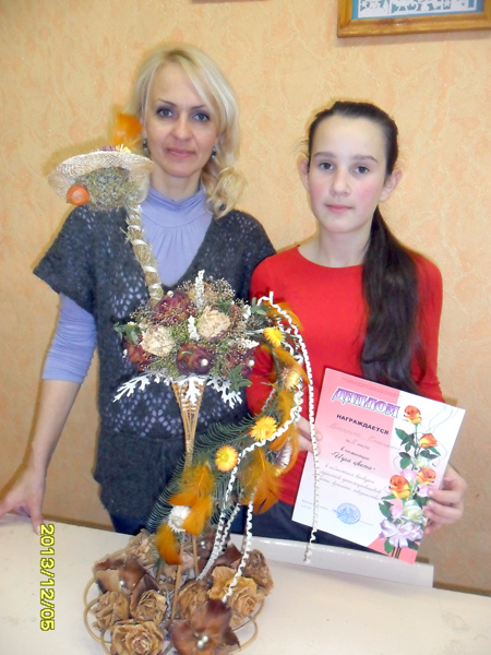 На традиционном областном конкурсе флористов-аранжировщиков «Цветы, красота, творчество» в нынешнем году были представлены работы четырех кружковцев учреждений дополнительного образования. Но только одна работа воспитанницы Радунского центра творчества детей и молодежи Елизаветы Блашко удостоена Диплома II степени в номинации «Игра цвета». Лиза учится в 7 классе Радунской гимназии, посещает школу искусств по классу фортепиано, занимается вокалом, пишет стихи и даже умеет печь пироги. Самым любимым занятием девочка считает декоративно-прикладное искусство. Свою первую поделку она сделала еще в детском саду, а сегодня в доме семьи Блашко уже нет свободных полок. Творческой фантазии Лизе не занимать, поэтому ее работы всегда отличаются новизной и оригинальностью. Немалая заслуга в ее творческих успехах принадлежит молодому педагогу и вдохновителю С.В. Святловской. Светлана Викторовна — непререкаемый авторитет у своих воспитанников. А все, видимо, потому, что сама горит идеями и умеет увлечь ими ребят.
